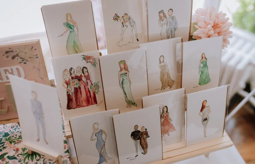 My assistant will take quick snaps of your guests so I can illustrate them on the spot! A perfect and thoughtful gift from you to your loved ones, capturing their presence and style as a beautiful memento of your celebration.